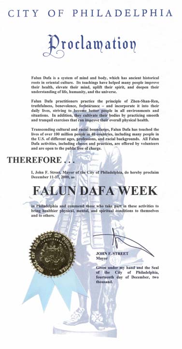 【明慧网2000年12月19日】 宾州费城市市长约翰 F. 斯准特(John F. Street )宣布法轮大法周(2000年12月11日--17日)