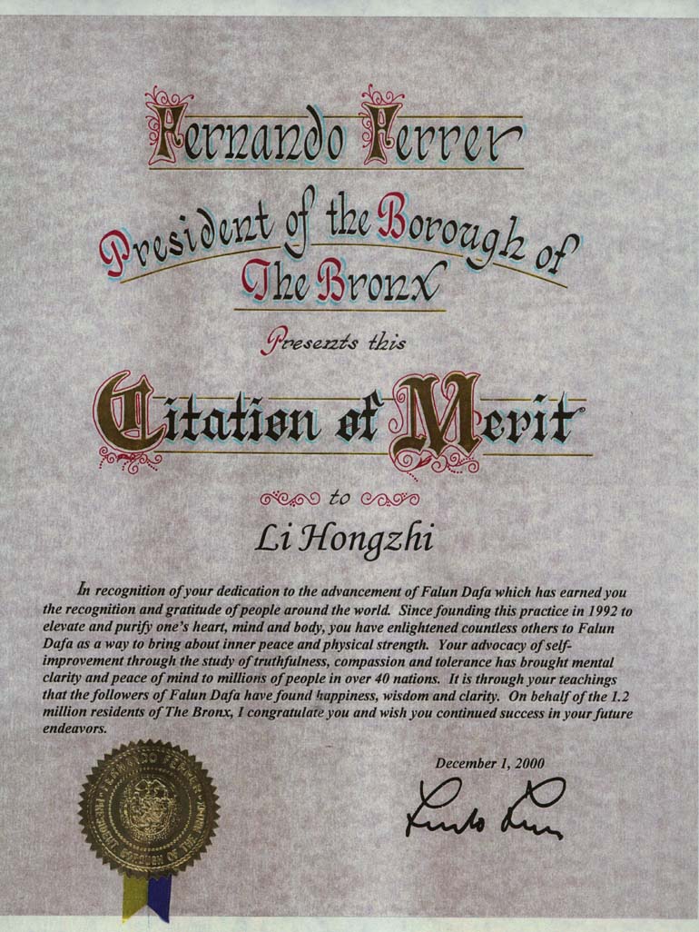 【明慧网2000年12月2日】 纽约州布朗士区区长费南多.费罗将此颂扬呈现给李洪志先生,以褒奖您致力于法轮大法的传播,仅此您赢得世界人民的颂扬和感激。自1992年此升华和纯化人们心、灵和身体的功法传出以来,您开启了无数人的智慧使他们悟到法轮大法带来的内心平和与身体强健。您倡导的通过学习真、善、忍而提高自身(的修炼方法)已给40多个国家的数百万人民带来了心智的纯净与平和。正是通过您的教导,法轮大法学员找到了幸福、智慧和纯净。代表着布朗士120万居民,我恭祝您将来继续成功。