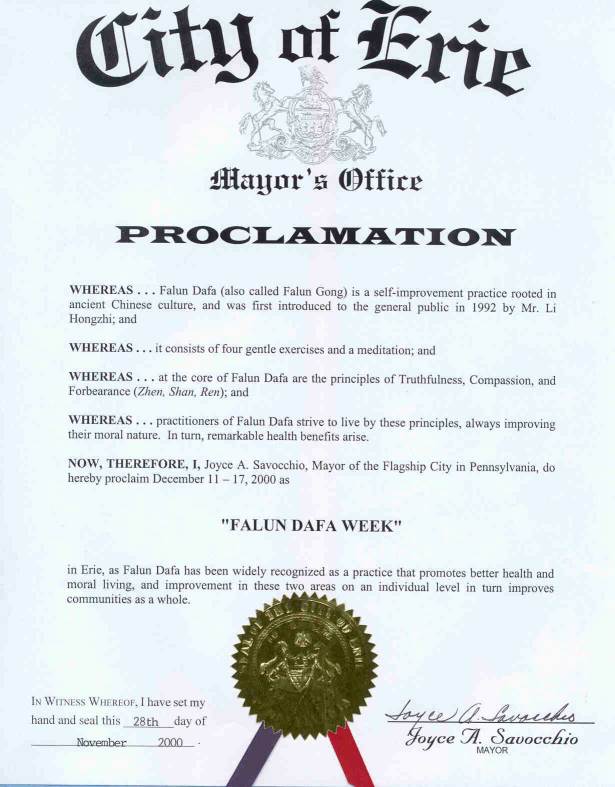 【明慧网2000年12月20日】 宾夕法尼亚州伊利市宣布2000年12月11日至17日为“法轮大法周”。
