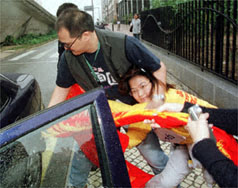 另外两批早已混进澳门的法轮功学员,则于下午三点左右先后在葡京酒店附近的友谊大马路海滨广场及皇朝广场,以身穿写满「法轮大法是正法」的运动衫,打开示威横幅「释放中国法轮功学员」,和集体当场练功的突击手法,在记者面前表达他们的抗议情绪。结果在数十位澳门便衣男女警员的大包围下,一一以强力抓上警车送走,前后至少拘捕了二十多人,其中包括一位金发外籍男士。