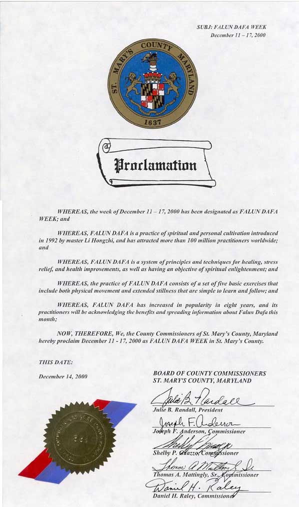 【明慧网2000年12月23日】 马里兰州圣玛丽郡宣布2000年12月11-17日为“法轮大法周”。