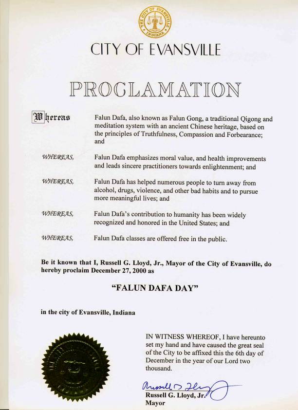 【明慧网2000年12月24日】 印第安娜州艾文斯维尔宣布2000年12月27日为“法轮大法日”