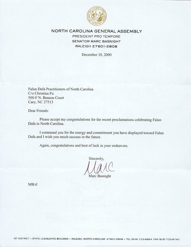 北卡罗来那州参议员对法轮大法褒奖的贺信