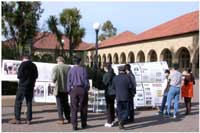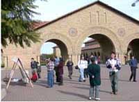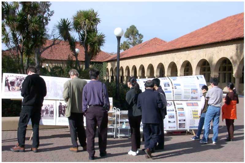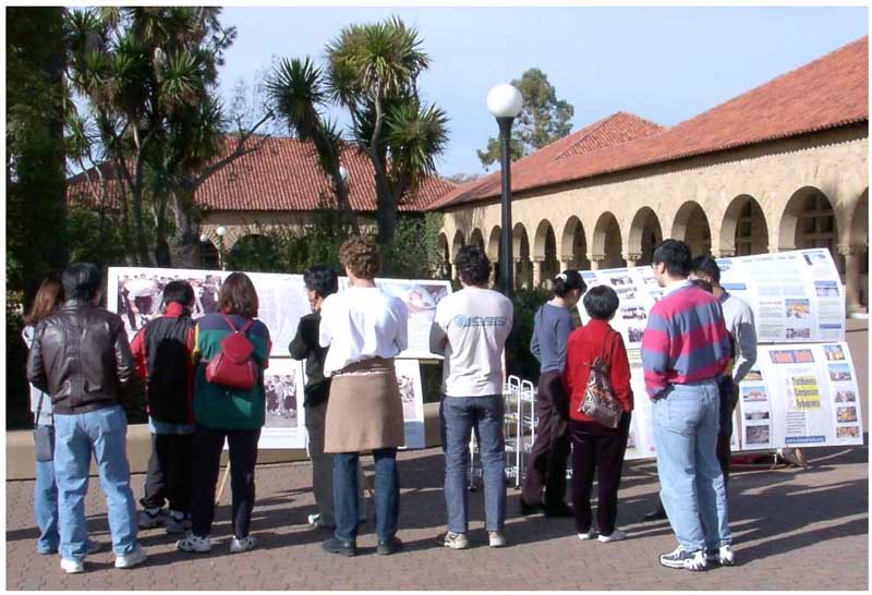 【明慧网2000年12月28日】圣诞节这一天,斯坦福大学主广场上,来来往往的人群川流不息。他们中大多是来观光旅游的,其中不乏大陆来的游客。当人们在这所世界著名学府的校园漫步时,意外地发现了十几幅醒目的法轮功图片介绍,不禁驻足。有的游人主动拿取图板旁边资料架上的报纸或散页。一天下来,在图板前留步的人不下七百人。