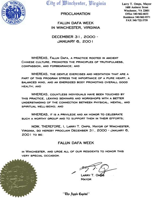 【明慧网2000年12月31日】 弗吉尼亚州维彻斯特市宣布2000年12月31日至2001年1月6日为“法轮大法周”