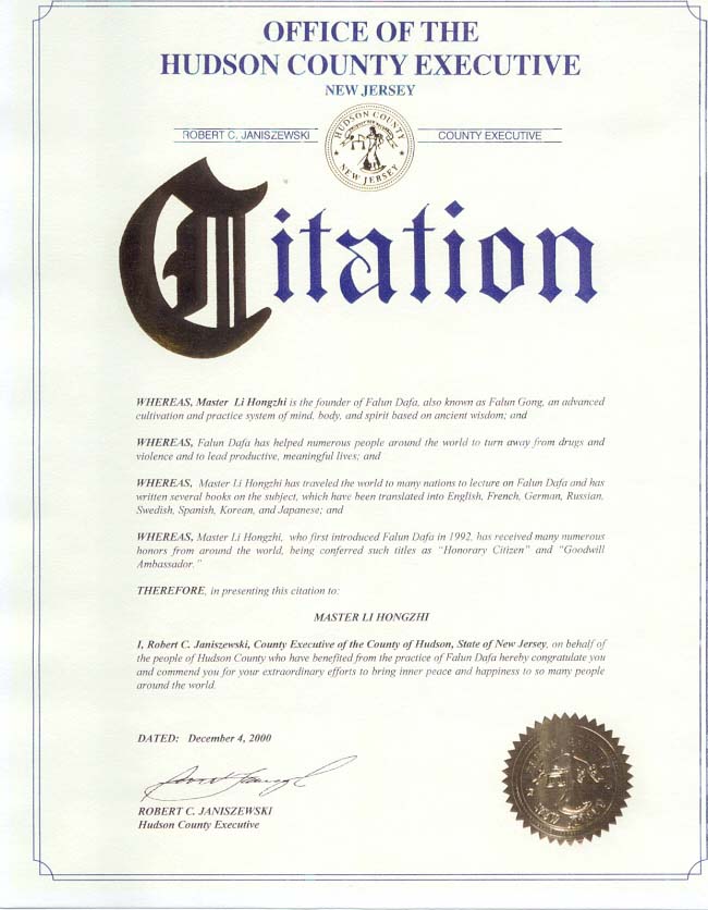 【明慧网2000年12月4日】 新泽西州哈德逊县行政执行官宣布“法轮大法周”,并同时发布对李洪志大师的嘉奖令