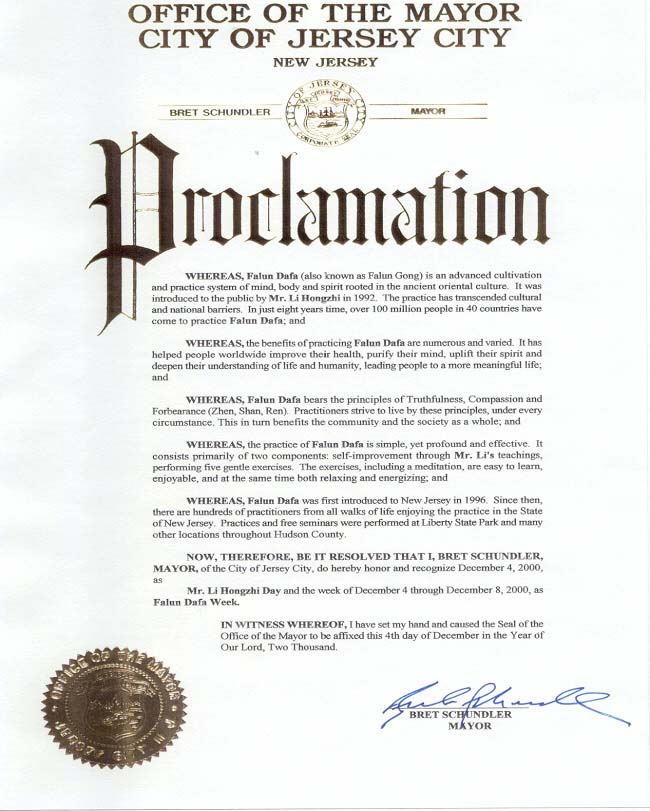 在这份宣布“李洪志先生日”和“法轮大法周”的公告中,Schundler市长再次表彰了李洪志大师和法轮大法对泽西市人民的贡献,赞扬了法轮大法学员“遵循真善忍的原则,在任何环境中都努力提高道德水准,从而使整个社区及全社会受益”。