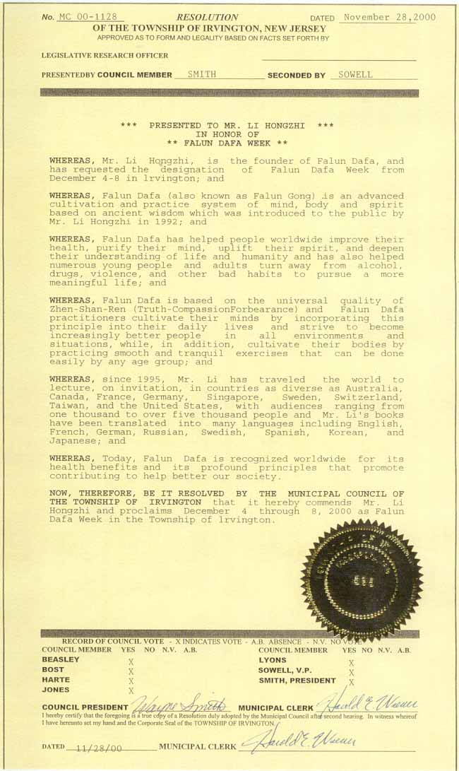 【明慧网2000年12月4日】 11月28日晚,新泽西州峨文顿市市议会决定对颁发法轮大法周的决议案进行讨论与表决。十多位新泽西州的大法学员应邀参加了旁听。本决议案由议长Smith先生和副议长Sowell先生共同提议。在表决前,一位市议员发言,她说原来她对法轮大法不了解,所以对此决议案表示异议,但当她阅读完了有关法轮大法的资料后,完全改变了原来的想法,现在她决定支持这一决议案。接着议员们进行了表决。结果是全体议员一致通过将12月4日至12月8日定为峨文顿市的法轮大法周,并对法轮大法创始人李洪志先生的贡献予以嘉奖。
