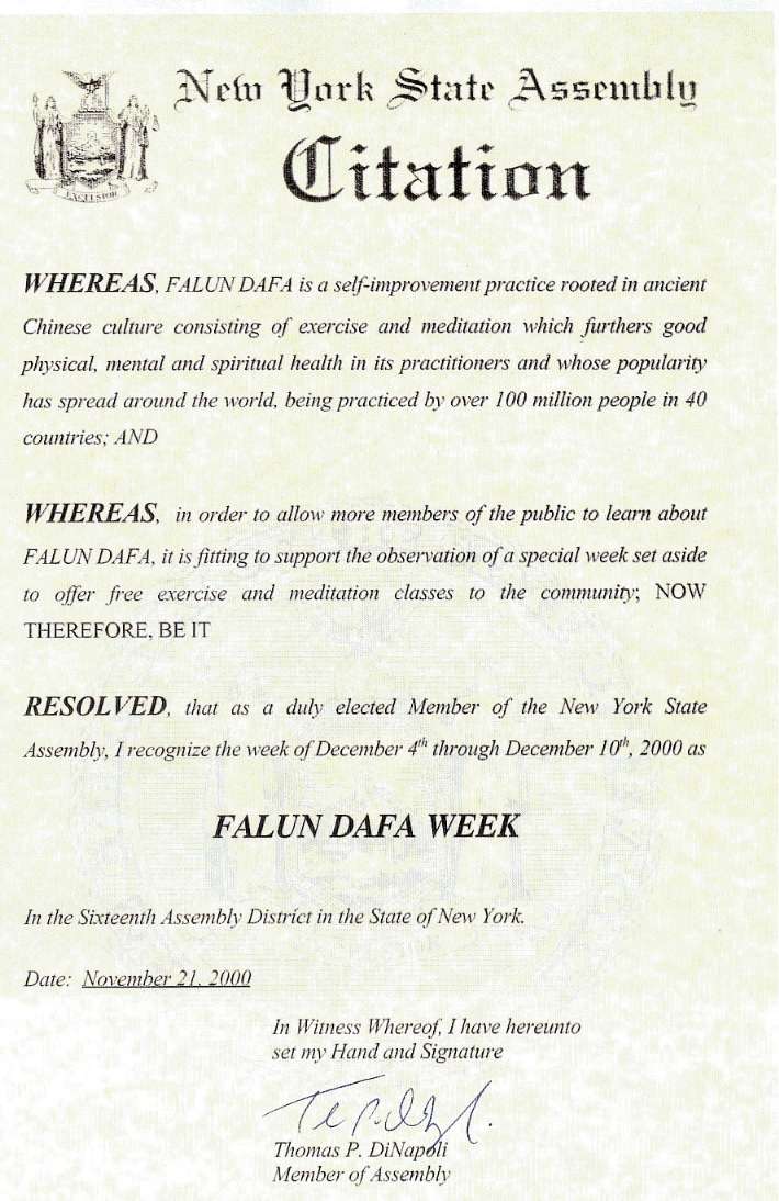 【明慧网2000年12月5日】纽约州第十六选区宣布2000年12月4日至10日为法轮大法周