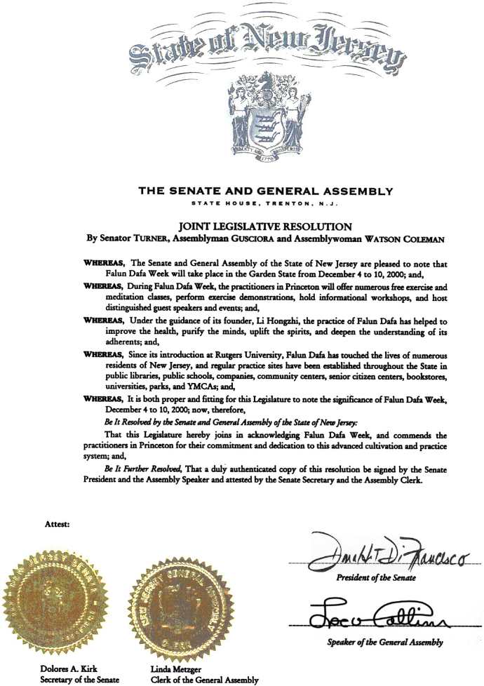 鉴于,新泽西州参议院和众议院高兴地注意到即将到来的2000年12月4日至10日的法轮大法周,并且;