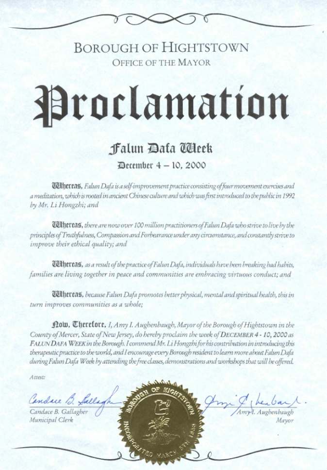 【明慧网2000年12月7日】 新泽西州海斯顿镇宣布2000年12月4日至10日为“法轮大法周 ”。
