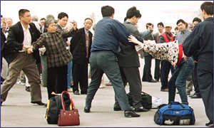 当每组人群一开始抗议,数百名看守广场的便衣中的一些人就扑向他们。天安门广场是中国心脏的标志,总是有很多游客来此在毛泽东主席巨幅照片的注视下观光。