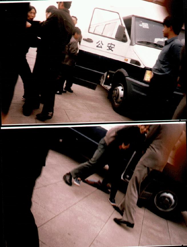 上图拍摄时间为“4.25”上午9点50分左右,黄沙漫天,途中的警察正在天安门广场往警车里抓大法弟子。