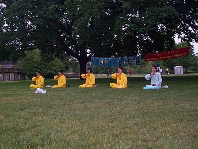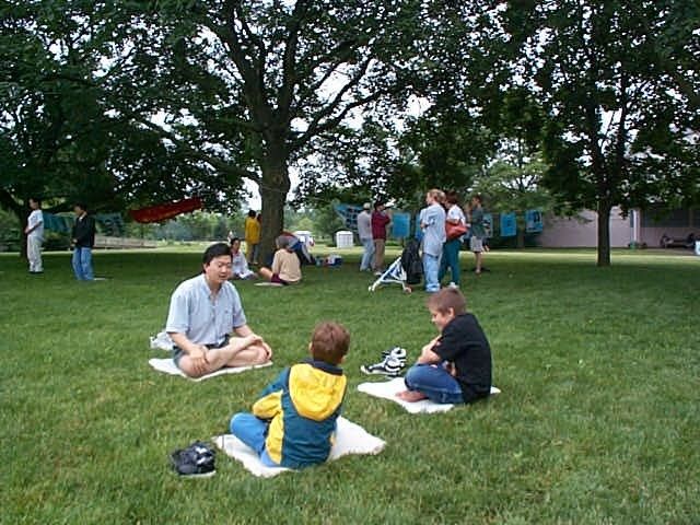 天气虽然不是很好,但过往的游人却很多,他们不时地驻步观看学员们炼功,索取大法资料。学员们热情地用中英文向他们介绍法轮大法,并教他们炼功的动作。一些中国国内炼过法轮功和对法轮功感兴趣的人们也前来询问了解情况,其中有一位刚从北京来哥伦布市探亲的功友没想到在这里还能找到炼功点,有缘和大法弟子遇到一起,感到非常高兴。