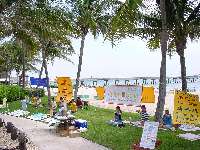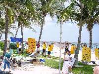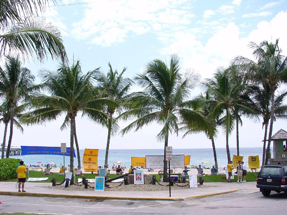 刚刚摆上资料,打起横幅,警察就赶过来查询,当我们拿出市政府的文件给他看时,他不相信地仔细研究了一会儿,我们又告诉他市政府已批准今天为“法轮大法日”,允许我们在这一段海滨的任何一处地点举行活动,警察又看了“法轮大法日”的证书,认为不可思议,他说:“这里从来不批准这样的活动,我只记得大概18年前才有这样的事,” 他又开玩笑地说,“也许是市长非常喜欢你们罢。”