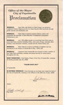 因此,现在,我,弗莱德·汉纳,阿肯萨州法耶特维市市长宣布2000年7月20日为法耶特维市 “法轮大法日”