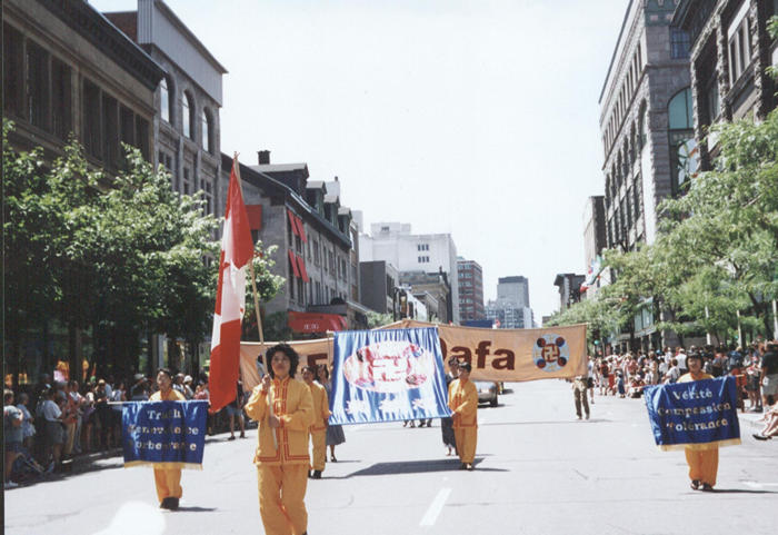 上午十一点,游行活动在10万名观众的期待中正式开始。在色彩鲜艳的英、法文横幅“真、善、忍”、法轮图形和大型“FalunDafa”横幅的引导下,在<<普度>>的音乐声中,缓缓地驶来了学员们精心装饰的大型彩车。绒布的深红色把彩车妆扮得庄重而有生气,两侧金黄色的“真、善、忍”(法文)格外醒目;似乎飘乎于蓝天白云之上的巨型莲花,托起的是2.4米高的<<转法轮>>(法文版)模型;十几位学员舒缓地演炼着五套功法。在彩车之后,行进中的近三十名学员,手执标有“真、善、忍”和“法轮大法”的彩旗及各色气球。场面祥和宁静,气氛感人至深。所到之处受到观众的热情欢呼,很多人竖起拇指向学员致意,许多人不断重复地喊着“Falun Dafa”,一些人追着彩车摄影录像,更多的人则是主动询问大法情况、索要大法资料。由于事前被告知,游行时不得主动派发资料,所以学员携带的资料不多;未料到索取资料者众多,在游行开始不久,所带英法文资料即被散发一空,立即复印也无法弥补即时所需。