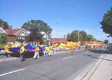 10点半左右,East York 大游行开始。整个游行队伍约有1公里,其中法轮功部分就有100多米,我们被安排在整个游行队伍的尾部,跟在一个军乐队的后面,十分引人注目。当学员们伴随着优美的普渡音乐开始游行时,法轮功的队伍很快成了游行队伍中的主角。在法轮功队伍的前部,是加拿大国旗和“庆祝加拿大国庆”的大横幅,随后是一个巨大的法轮图形、介绍法轮大法及真善忍的大标语等。