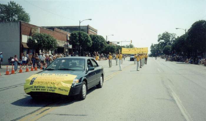 【明慧网2000年8月23日】8月12日,来自堪萨斯(Kansas)和密苏里(Missouri)州的十几位法轮大法学员参加了一年一度的堪萨斯州约翰森郡(Johnson County Fair Parade)的集市游行。身着印有“法轮大法”及“中国法轮功”黄色T恤衫的大法学员们排着整齐的队列,高举着“法轮大法真善忍”的黄色旗帜,在一辆前面及右侧均挂饰着“法轮大法”及“真善忍”黄色旗帜的轿车的引导下,缓缓行走在游行的街道上。悲壮宏亮的普度济世音乐向善良的人们展示着宇宙大法的慈悲和庄严。