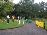 8月6日早上,听说这里有一个军事博览节,我们很早就来到了展览军备的公园炼功。当我们开始打坐时,各种军用车辆发出巨大的响声从我们旁边开过。由于公园里人不多,我们就到马路边炼功,直到中午才离开。