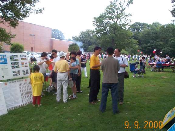 伴着悠扬动听的大法音乐,学员们开始展示五套功法,顿时吸引了众多人的注意。一位女学员带着两个女儿,一个四岁,一个六岁,把大法简介送给四周的人群。四岁的小女儿开始时不知道要说什么,跟着妈妈转了几圈后,也一手拿着大法简介,一手拿着英文报纸,不停向周围的人问:“您想更多地了解法轮功吗?”看着她那纯真、稚气的小脸,大多数人都接过资料,认真阅读起来。