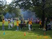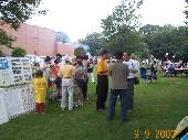 活动十二点开始,这次活动有不少健身和功法介绍,法轮功被特别安排在室外的一片绿荫上。中英文“法轮大法”,“真,善,忍”横幅在阳光下格外醒目。