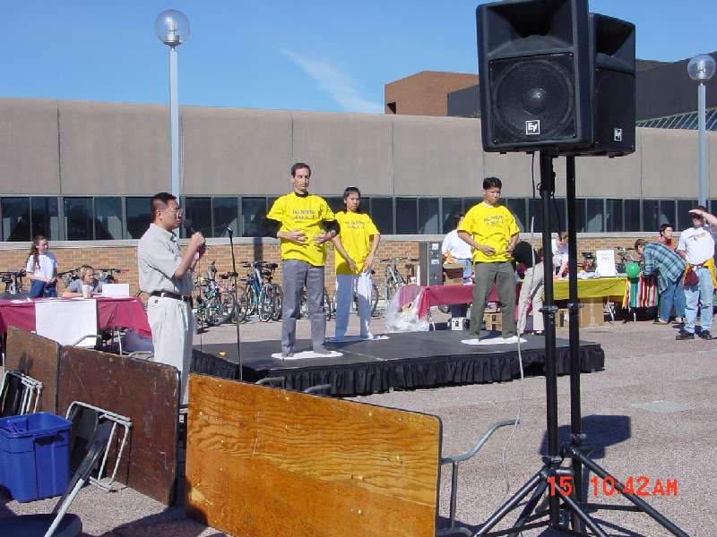 学员们在会场上进行半小时的功法表演同时配有英文解说。使人们了解法轮大法大圆满法的五套功法的功理。其间,大法宣传资料和修炼故事散发到很多人手中。