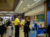 蓝底黄字的法轮大法横幅清澈明亮地悬挂在展厅的正前方,十分醒目。宽敞的展位前摆放着大法宣传板,展台上陈列着丰富的中英文的大法介绍资料,电视中连续地播放着大法功法教功带和大法简介录像带。随着悠扬的炼功音乐,学员们整齐地炼着五套功法,吸引着众多的参观者和参展者。