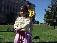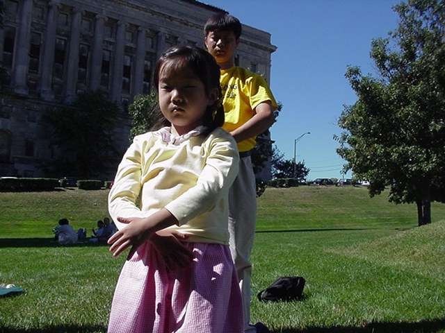 一位七岁的中国小女孩看我们炼静功时也想学,和我们一起炼了近半个小时后才离去。看她这么喜欢我们的功法,我们送她了一本<<法轮大法>>,并请她的妈妈每天给她念一段。