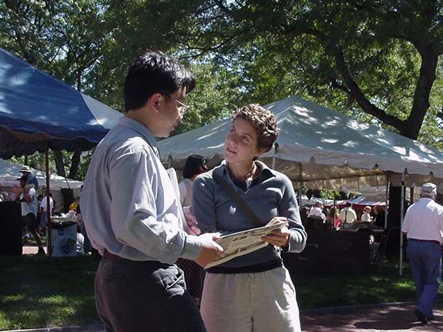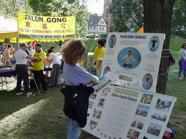 一位美国人前几天打电话说看到法轮功报纸后很愿意进一步了解法轮功。我们告诉他星期六的活动后,他早早地来到我们的展位,并马上学习五套功法。问了很多问题。当听说法轮大法是性命双修的功法后,他非常兴奋,并告诉我们这就是他一直要找的功法。虽然他学其它气功许多年,但没有一个满意的。这位有缘人在我们展位前流连忘返。几次回来与学员交谈。他说如果不是腰有毛病,他马上会加入我们的炼功队伍。带着<<法轮功>>,他满意地走了,还表示一定要来参加我们将在图书馆举办的介绍班。