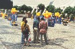 那天,大法学员三五成群坐在稀疏树荫下交流心得和学法,一些学员拿著洪法资料向途人介绍大法。虽然天气很热阳光很猛烈,但是男男女女、老老少少总是面带慈善的笑容。大法的音乐在广场回旋,一些途人被大法慈悲的力量吸引了过来。