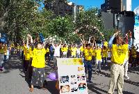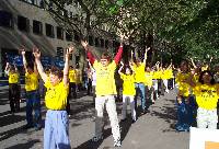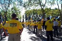 学员们随着音乐开始一遍又一遍地演炼五套功法。临街的前排学员手持“一亿法轮功修炼者为何遭迫害”,“呼吁中国政府停止迫害法轮功”等标语,希望引起世人对中国政府粗暴无理处理法轮问题的关注。