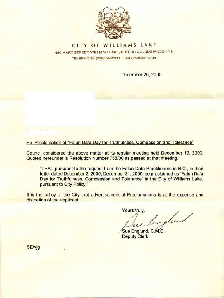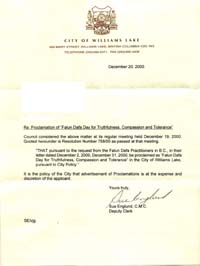 【明慧网2001年1月10日】 加拿大不列颠哥伦比亚省威廉斯湖市宣布2000年12月31日为“法轮大法真善忍日”。