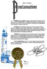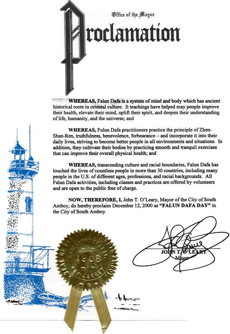 【明慧网2001年1月10日】新泽西州南安波溢市市长宣布2000年12月12日为“法轮大法日”。