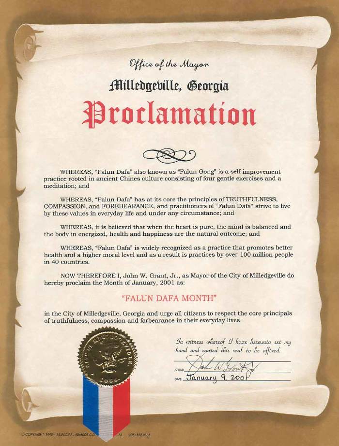 【明慧网2001年1月11日】 乔治亚州密莱基维尔市宣布2001年1月为“法轮大法月”