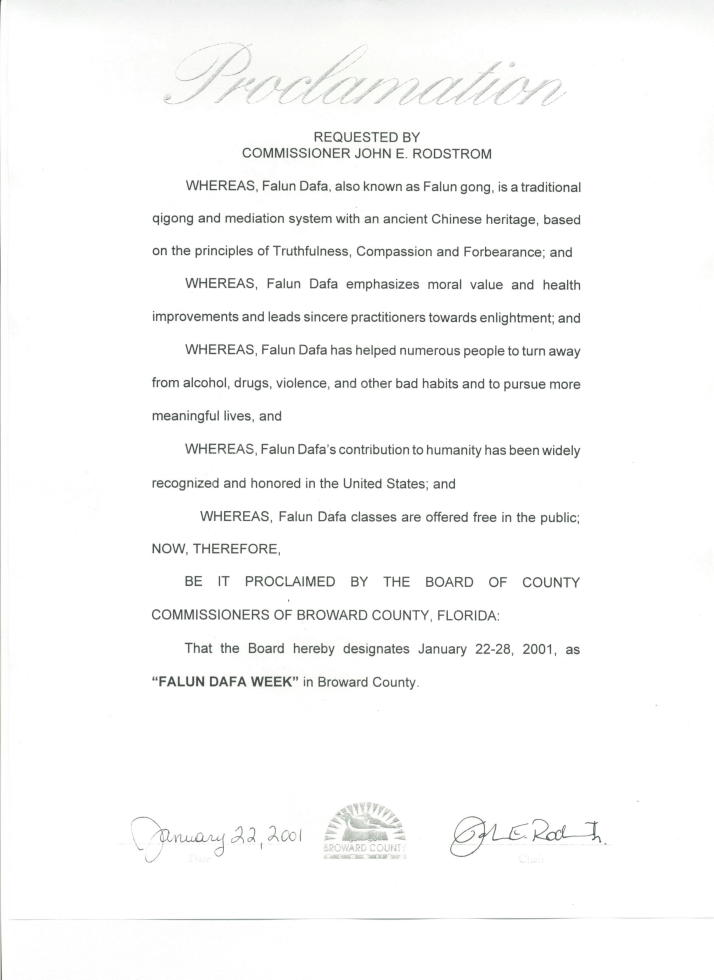 【明慧网2001年1月13日】 佛罗里达州包和县宣布2001年1月22-28日为“法轮大法周”