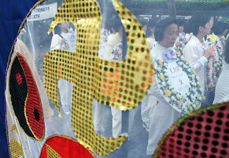 走在队伍最前面的是120位身穿白色衣服( 中国哀悼颜色)的人们,她们手举120名被害法轮功追随者的照片,据此团体称,他们都是在大陆中国警察拘押期间被折磨致死。