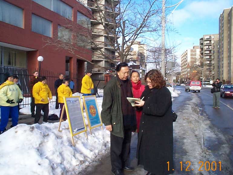 面对寒冷的天气,新闻媒体又一次对法轮功的报道表示出极大的热心,有五家电视台前来采访,他们不仅全面地报道了新闻发布的过程,而且对在冰天雪地下静静炼功的群体恋恋不舍,有一家电视台几次要求学员延长练功时间,以便把练功的场面作为新闻十分难得的背景摄入摄像机中。自从去年十月起,在每个工作日都有学员自发地到领馆门前炼功一两个小时,同时借此机会向中国政府表达释放所有被关押学员的心愿。有的学员表示:只要邪恶势力还在镇压法轮功,我们就一天不停止到领馆前和平请愿。在今天的新闻发布会上,法轮功学员表示:对法轮功的镇压是邪恶的,是江泽民利用非法获取的权势胁迫中国政府屈从于它的淫威而犯下的滔天罪行。释放一个张昆仑是远远不够的,必须无条件释放全中国所有被关押的法轮功学员,推翻全部强加在法轮功和修炼者身上的不实之词,还历史以清白。前来采访的媒体包括加拿大国家电视台CBC,世界日报,CTV,CITYTV,CFMT,680Radio,CFTO,多伦多太阳报、星岛日报等。