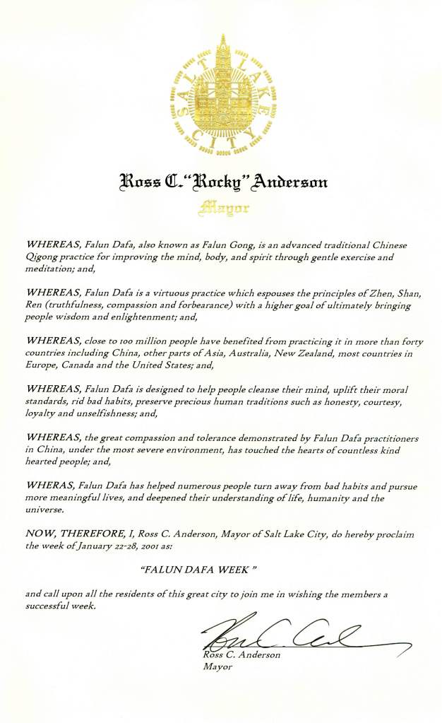 【明慧网2001年1月15日】 犹他州盐湖城宣布2001年1月22-28日为“法轮大法周”