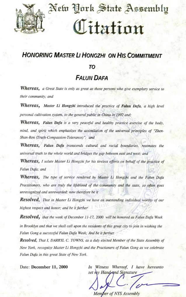 特此,我,DARRYLC。TOWNS,正式选举的纽约州众议员,褒奖李洪志大师和法轮功修炼者同时在伟大的纽约州庆祝法轮大法。