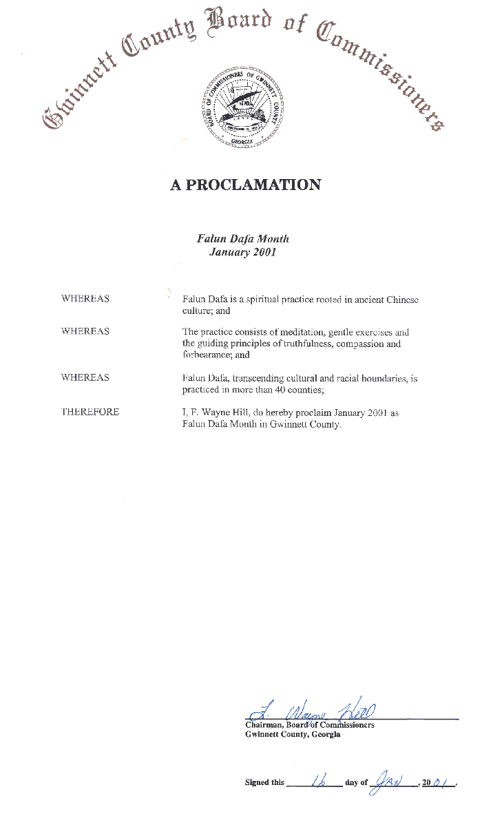 【明慧网2001年1月19日】 乔治亚州规耐特市市长宣布2001年1月为“法轮大法月”