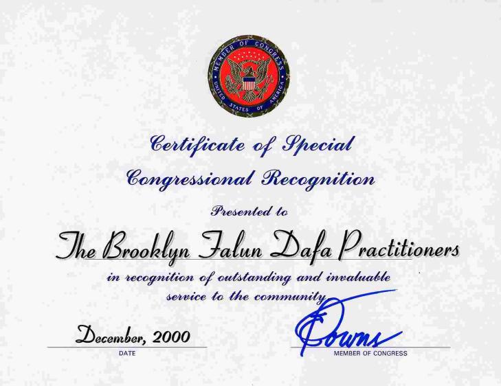 【明慧网2001年1月20日】 美国国会议员于2000年12月向纽约市布鲁克林区法轮大法学员颁发特别国会嘉奖令。