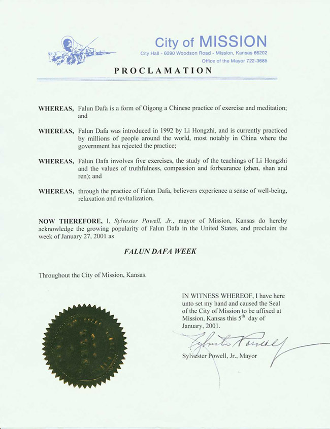 【明慧网2001年1月21日】 堪萨斯州密新市宣布2001年1月27日 - 2月3日为“法轮大法周”。