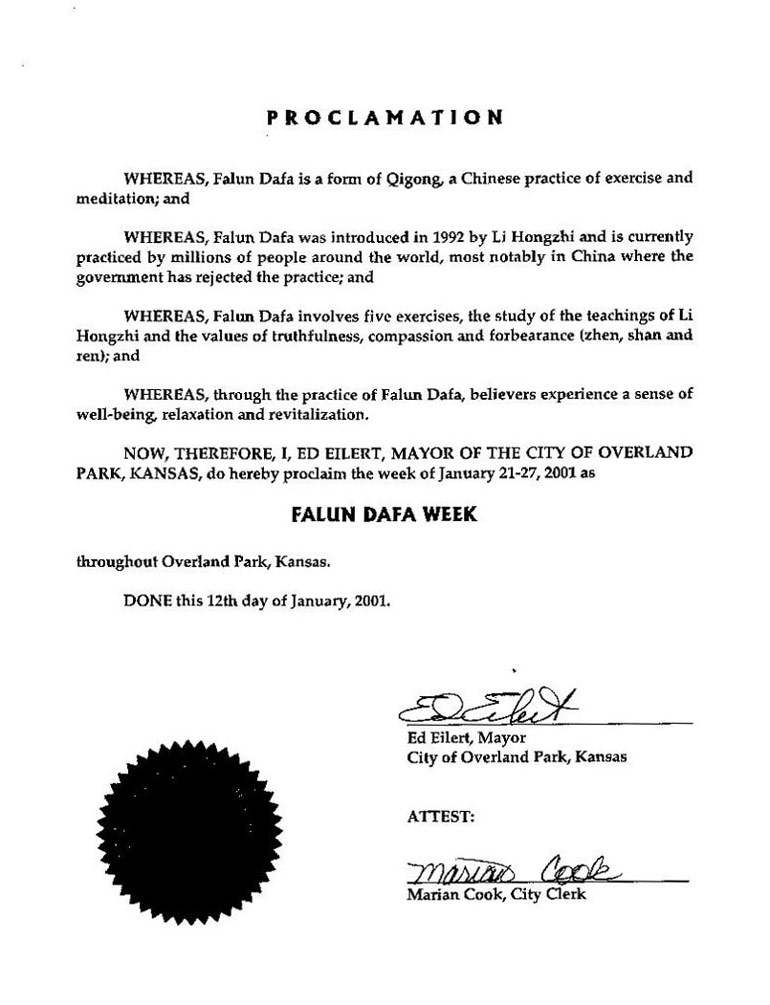 【明慧网2001年1月21日】 堪萨斯州欧副兰德派克市宣布2001年1月21-27日为“法轮大法周”。