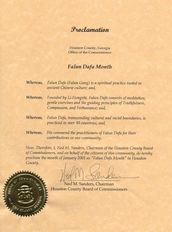 【明慧网2001年1月23日】 乔治亚州胡顿市宣布2001年1月为“法轮大法月”。