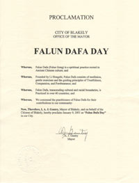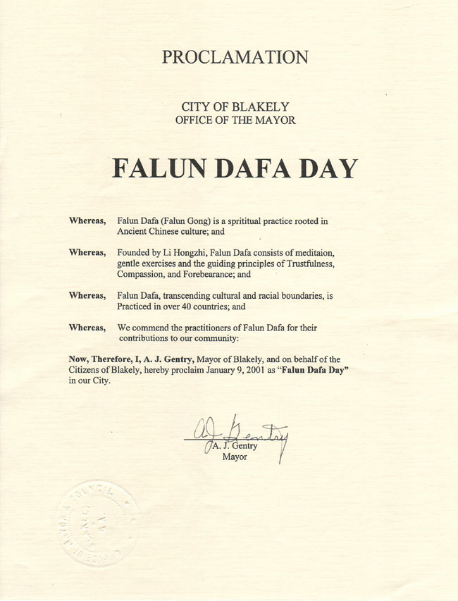 【明慧网2001年1月23日】 乔治亚州布雷克里市宣布2001年1月9日为“法轮大法日”。