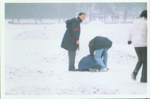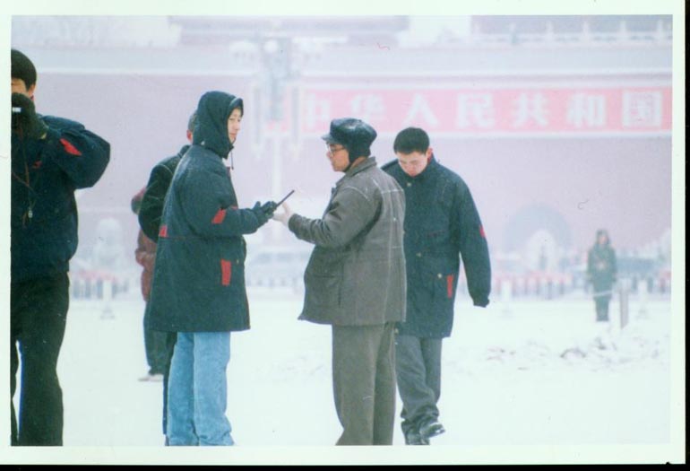 凡是走进广场的游人都被严密监视,尤其是中老年人更是遭到强行盘查(见图一),翻包质问是不是法轮功学员,稍有解释不清,口齿笨拙者马上就被推上警车抓走,根本无人权可言,刚刚有二位五十岁左右的妇女被质问几句话就被推上警车,一会儿,又围住一个戴眼睛的老先生(见图二),老者连续解释了十多分钟才没被抓走。就在此同时,一位身穿蓝布大衣,手拎一个红色小布包的老年妇女就没有那么幸运了,只见二个穿蓝色羽绒服的便衣上前就将老年妇女打倒在地(见图三),然后把他手里的红色提包抢走(见图四)。即便如此还不过瘾,等老年妇女欲将再站起来时,另一个站在他身后的便衣用腿再一次将她绊倒,如此几次,招来多位游客驻足观看。在确信她不会再有反抗之意,才驱散游客,老年妇女被按倒在地(见图五),一位留下看守,一位向警车走去。警车开来时,老妇人是被警察拽着胳膊扔进警车的(见图六),随后还有人跟上踹上一脚。动作之流畅,足见其多次演练过,即便上了车,事情还没完,透过车窗,警察再次对这位老年妇女施加暴力(见图七),在整个盘问到抓到警车老年妇女并没有丝毫反抗。这边的事刚过,一件振奋人心的情景出现在我们面前,只见在广场西北侧大法弟子拉开了一个宽一米,长十米的大法横幅。警察、便衣、小平头们一起惊慌地向他们跑去。有的学员在抛洒真相资料,风一吹,警察、便衣满地乱捡,然后他们开始驱散行人和游客,不许他们上前。大法弟子为了不让邪恶抓走,一起向外跑,站在各个角落的便衣也纷纷上前,这件事持续了大约20分钟,站在广场的游人纷纷在议论,当有人谴责警察时,就遭到便衣的监视,游人吓得也就不敢说什么了。这些便衣一会儿聚集到了一个地方商量(见图八),一会儿又换了一身烟灰色大衣,然后又再一次出现在广场,大概是怕人认出来,原来它们也很心虚啊!