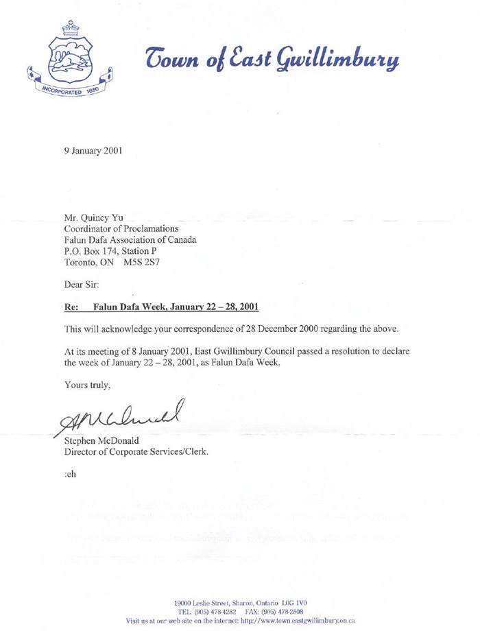 【明慧网2001年1月25日】 加拿大安大略省东吉威廉伯格镇宣布2001年1月22-28日为“法轮大法周”。