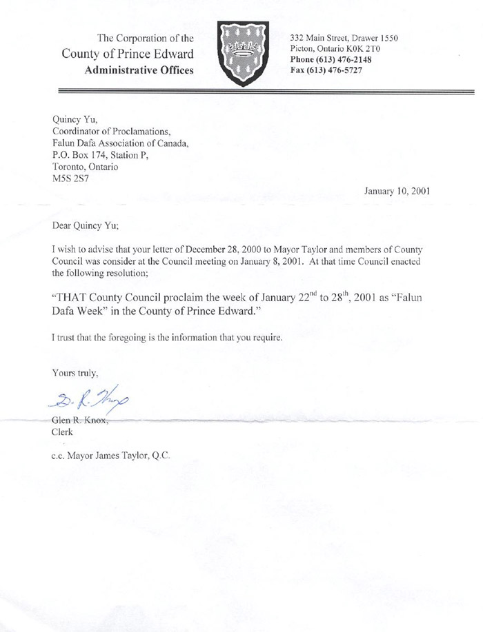 加拿大安大略省爱得华王子郡宣布“法轮大法周” 【明慧网】
