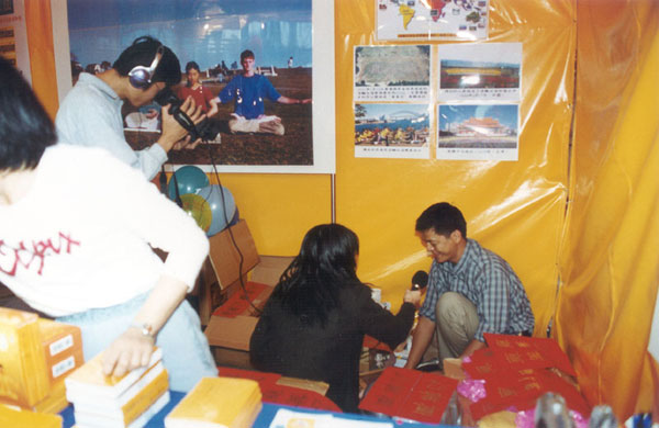 | 荃湾年宵摊档:正在以丝网印刷“真善忍”挥春的学员接受记者采访,展销结束后更有市民致电索取“真善忍”挥春。 | 位于香港闹市中心的维多利亚公园也设有法轮功年宵摊位,吸引着市民投来好奇的目光。 |